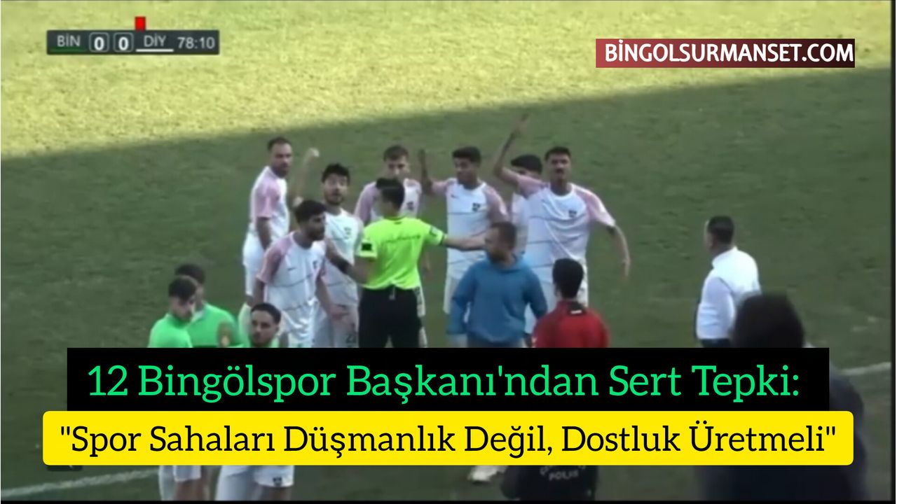 12 Bingölspor Kulüp Başkanı Mehmet Engin Özturan, dün oynanan 12 Bingölspor - Diyarbekirspor maçında yaşanan olaylara ilişkin sert bir açıklama yayımladı. Özturan, Diyarbekirsporlu iki futbolcunun kendisine yönelik küfür, hakaret ve tehditlerde bulunduğunu belirterek, Türkiye Futbol Federasyonu'ndan (TFF) inceleme talep etti.