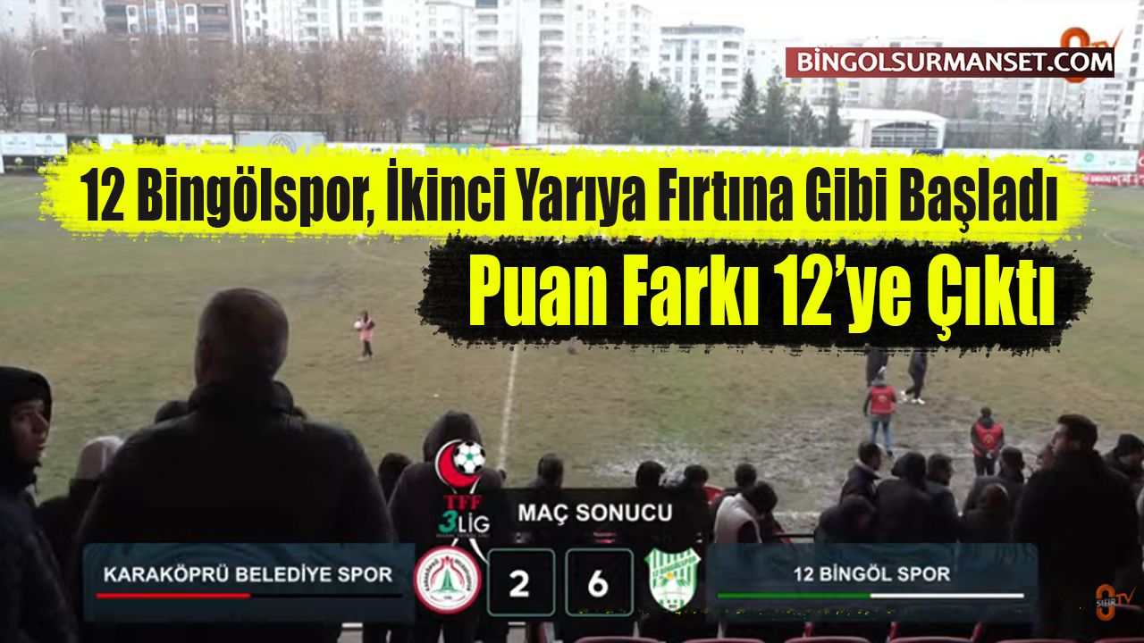 3. Lig 2. Grup'ta 2025-2026 sezonunun ikinci yarısı başladı. Ligi ilk yarıyı 10 puan farkla lider kapatan 12 Bingölspor, ikinci yarıdaki ilk maçında Şanlıurfa deplasmanında Karaköprü Belediyespor'u 6-2 gibi farklı bir skorla mağlup etti. Bu galibiyetle liderlik avantajını 12 puana yükseltti.