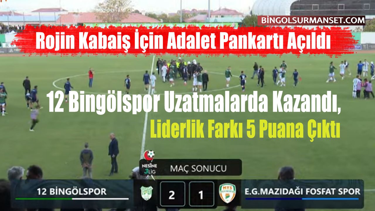 Nesine 3. Lig 2. Grupta liderliğini korumaya çalışan 12 Bingölspor, kendi sahasında Mazıdağı Fosfatspor'u ağırladı. Normal süresi 1-1 biten karşılaşmada, 12 Bingölspor uzatma dakikalarında bulduğu golle maçı 2-1 kazandı. Bu sonuçla puanını 21'e yükselten 12 Bingölspor, en yakın rakibi Niğde Belediyespor'a 5 puan fark attı.