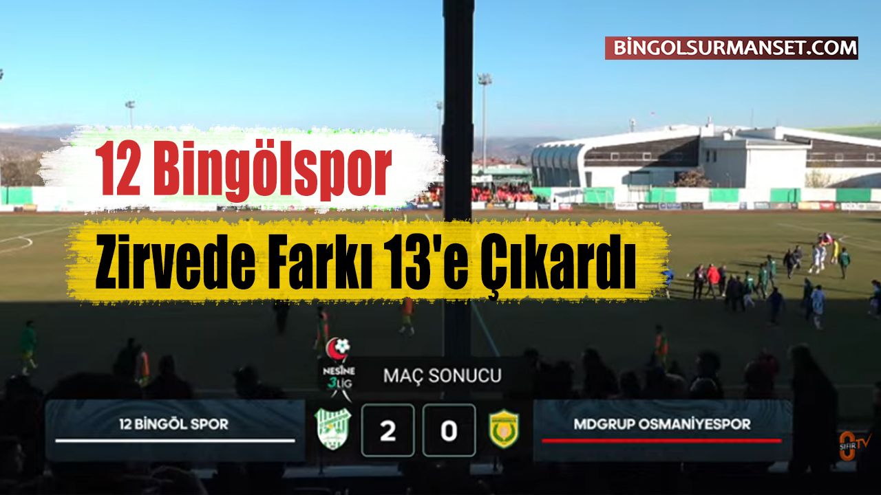 TFF 3. Lig 2. Grup'ta liderliğini koruyan 12 Bingölspor, sezonun 14. haftasında evinde Osmaniyespor'u ağırladı. Bingöl Şehir Stadyumu'nda oynanan ve ilk yarısı 1-0, tamamı 2-0 biten maçta liderlik koltuğunu daha da sağlamlaştırdı.
