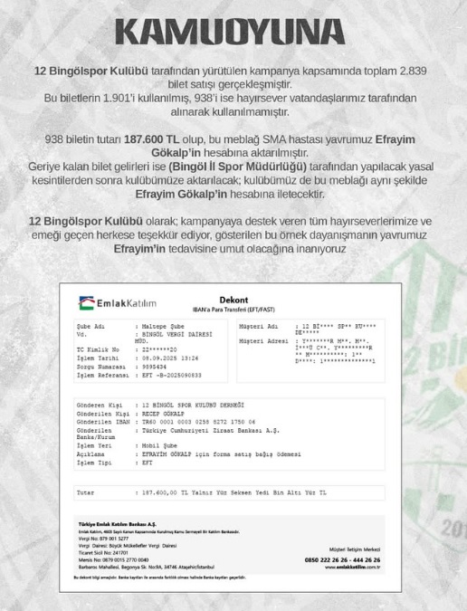 Kulüp yönetiminden yapılan açıklamada, söz konusu tutarın dekontu paylaşılırken, geriye kalan 1.901 biletten elde edilecek gelirin de Bingöl İl Gençlik ve Spor Müdürlüğü tarafından yapılacak yasal kesintilerin ardından kulübe aktarılacağı, sonrasında ise Efrayim bebeğin hesabına yatırılacağı belirtildi.