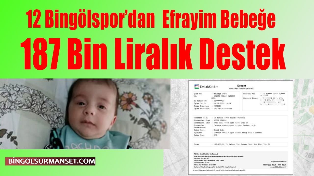 12 Bingölspor Kulübü, sezonun ilk maçında başlattığı anlamlı kampanya kapsamında önemli bir bağışı daha Efrayim bebeğin tedavisi için aktardı. Hayırseverler tarafından satın alınan ancak kullanılmayan toplam 938 maç biletinden elde edilen 187 bin 600 lira, SMA hastası Efrayim Gökalp’in hesabına yatırıldı.