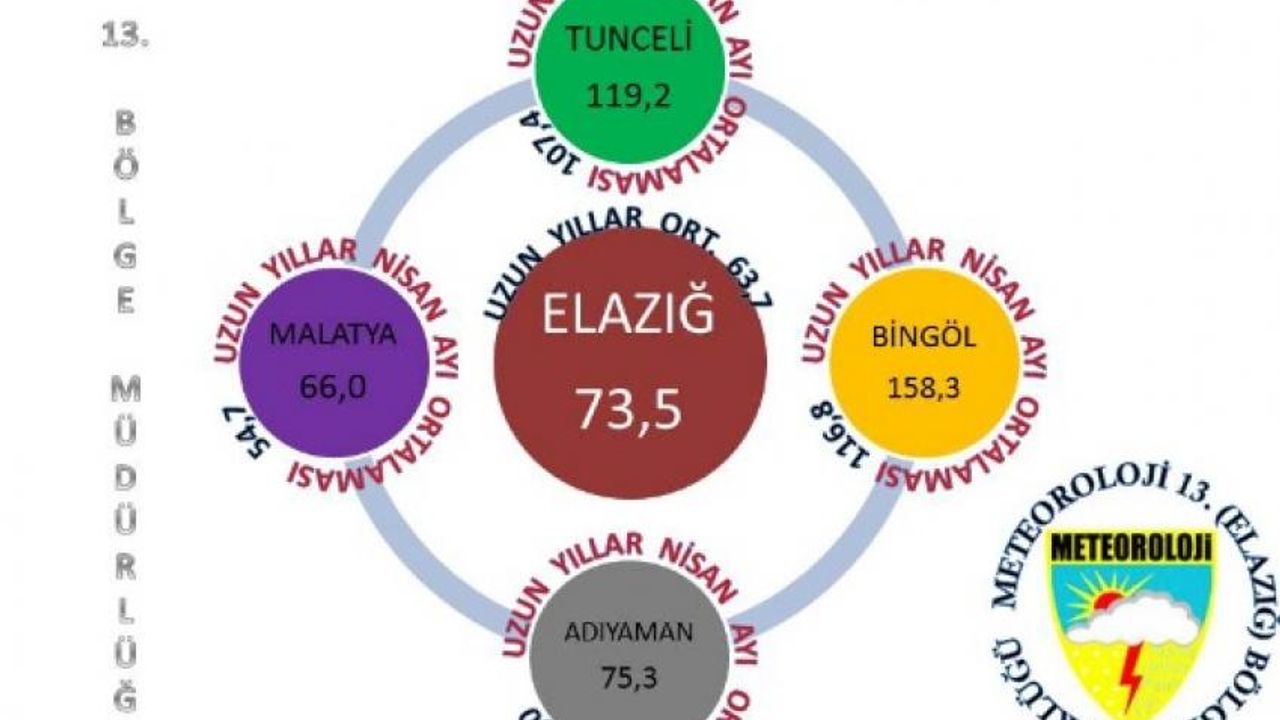 Meteoroloji 13. Bölge Müdürlüğü, Bingöl’e Nisan ayı içinde 158,3 oranında Tunceli’ye 119,2, Adıyaman’a 75,3, Elazığ’a 73,5 ve Malatya’ya 66,0 oranında yağmur yağdığı açıklandı.