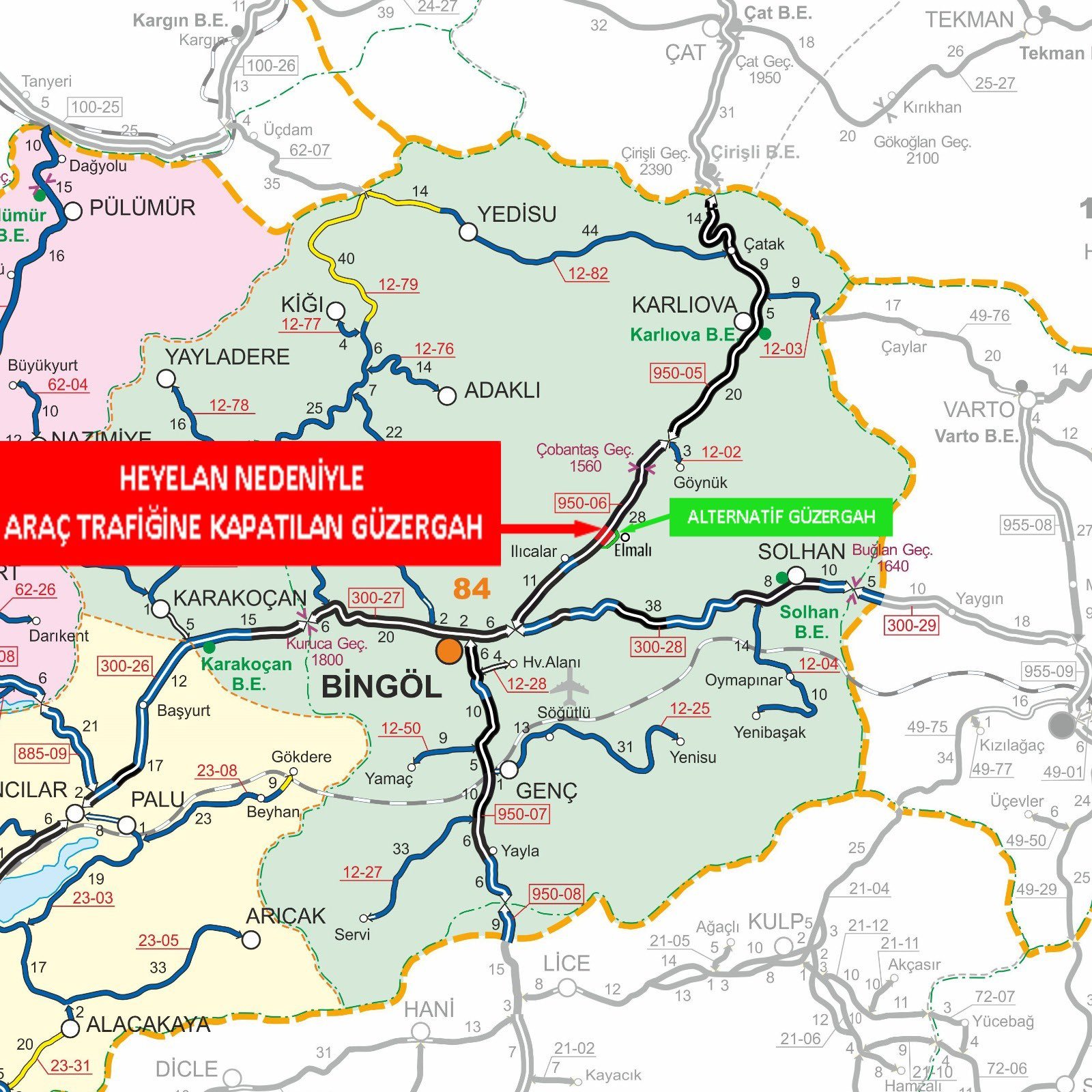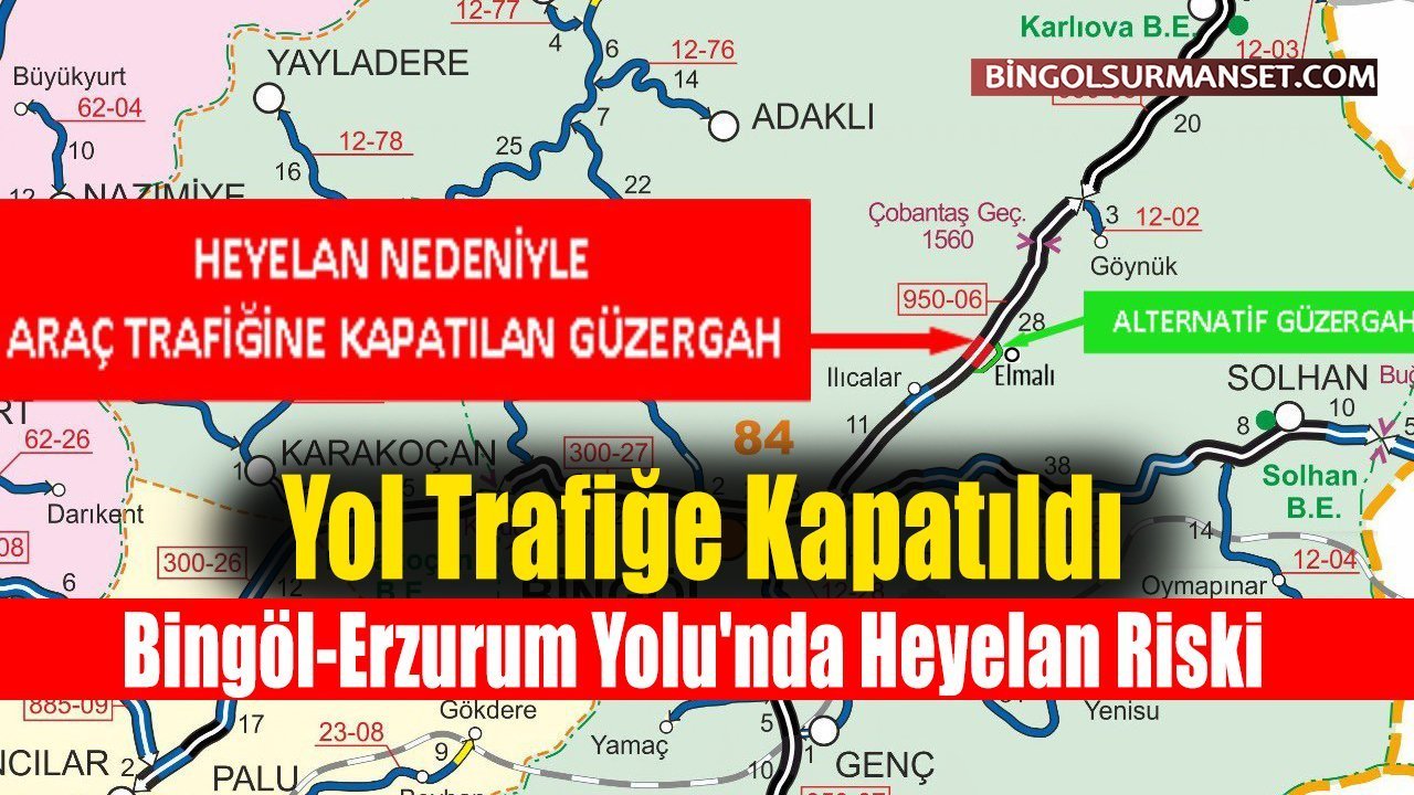 Bingöl Valiliği'nden yapılan açıklamaya göre, Bingöl-Erzurum Devlet Yolu'nun 21+000 ile 22+900. kilometreleri arasında yarma şevinde meydana gelen hareket nedeniyle heyelan riski oluştu. Trafik güvenliği açısından risk taşıdığı tespit edilen yol kesimi, 11 Nisan 2026 Cumartesi günü saat 03:10 itibarıyla araç trafiğine kapatıldı.