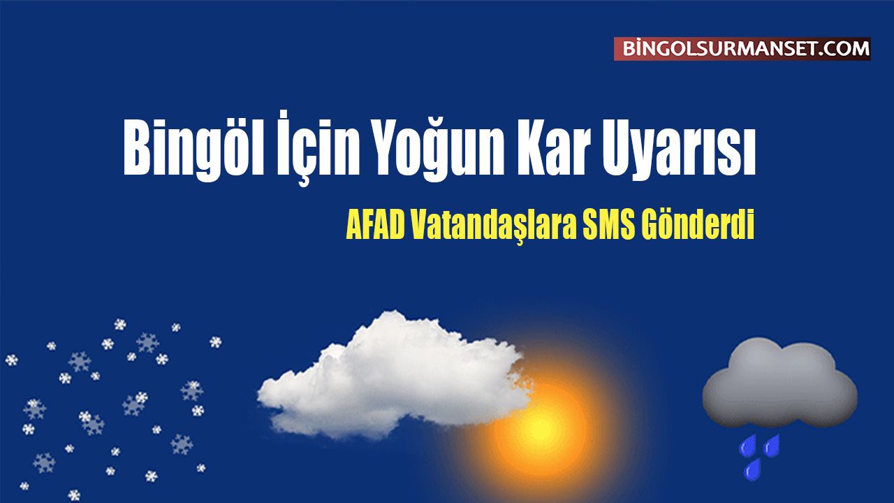 Afet ve Acil Durum Yönetimi Başkanlığı (AFAD), Bingöl'deki vatandaşlara bir SMS uyarısı gönderdi. Meteoroloji Genel Müdürlüğü verilerine atıfta bulunulan uyarıda, yarın Bingöl'de yoğun kar yağışı beklendiği bildirildi.
