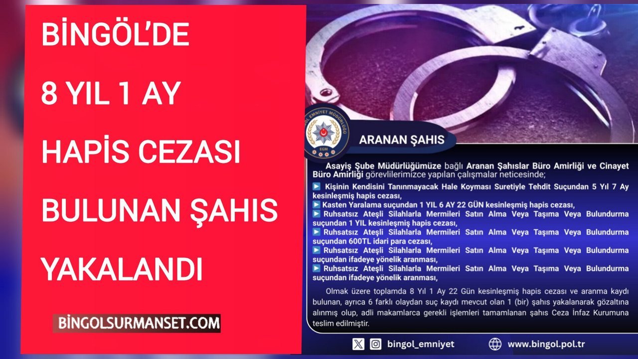 Bingöl Emniyet Müdürlüğü Asayiş Şube Müdürlüğü ekipleri, kentte aranan şahıslara yönelik çalışmalarını sürdürüyor. Yapılan açıklamada, “Kasten Yaralama, Ruhsatsız Ateşli Silahlarla Mermileri Satın Alma veya Taşıma veya Bulundurma ve Tehdit” suçlarından hakkında 8 yıl 1 ay 22 gün kesinleşmiş hapis cezası bulunan bir şahsın yakalandığı bildirildi.
