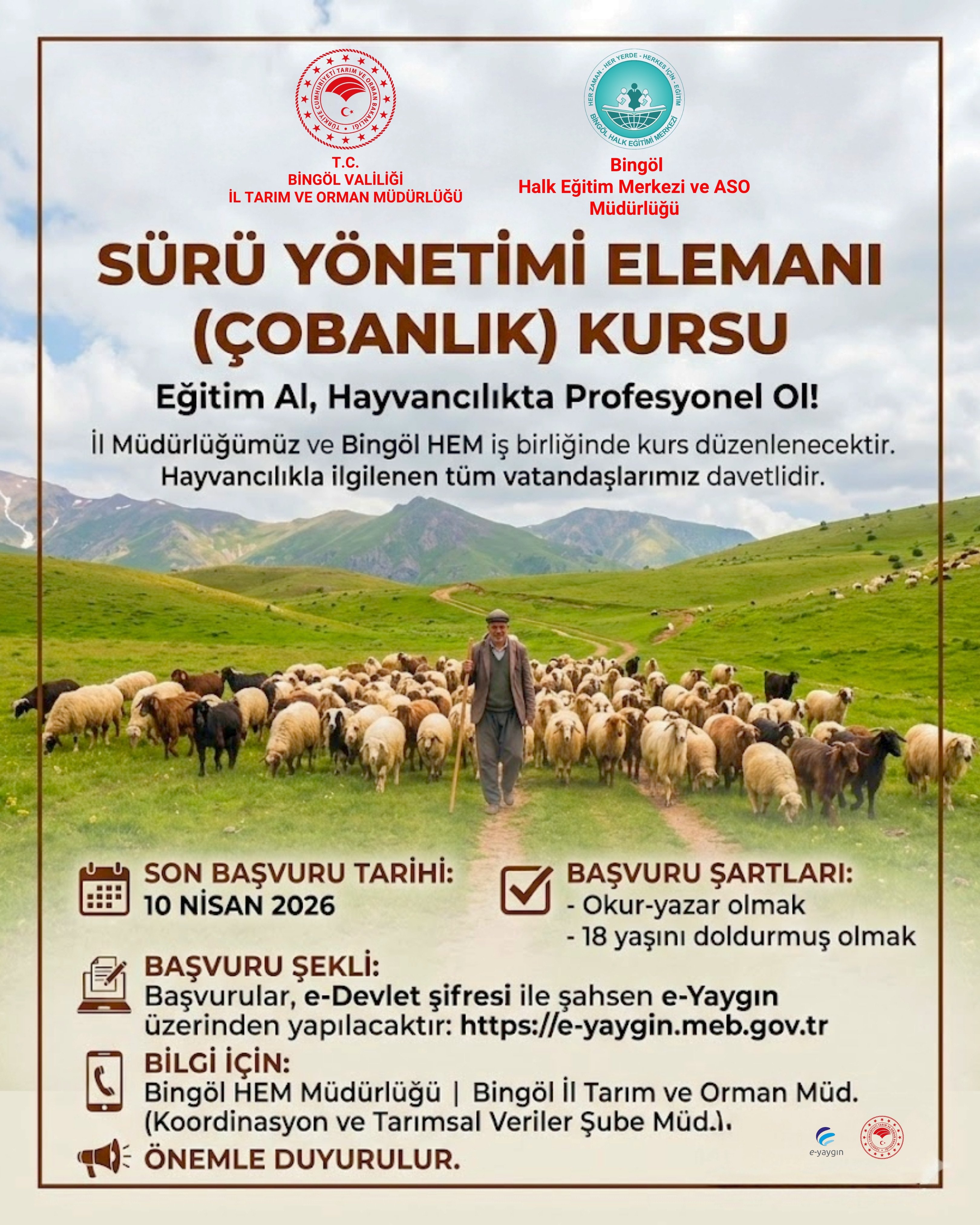 Bingöl İl Tarım ve Orman Müdürlüğü, Bingöl Halk Eğitim Merkezi ve ASO Müdürlüğü iş birliğinde hayvancılık sektörüne nitelikli eleman kazandırmak amacıyla Sürü Yönetimi Elemanı (Çobanlık) Kursu düzenliyor. Kurs, hayvancılıkla uğraşan veya bu alanda kariyer yapmak isteyen vatandaşlara yönelik olacak.