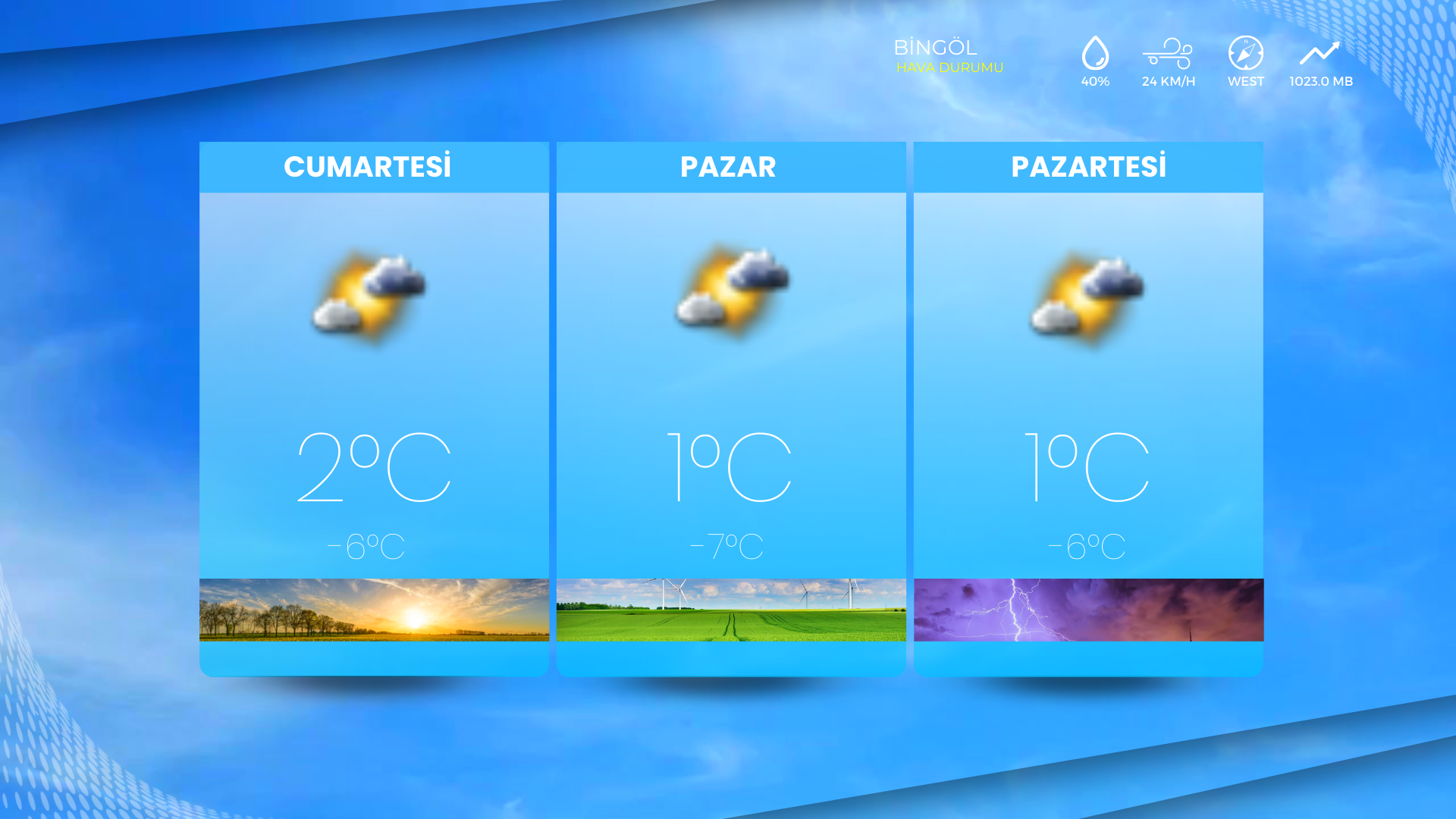 Bingöl’de 8 Şubat Cumartesi günü çok bulutlu bir hava hâkim olacak. Sabah saatlerinde hava sıcaklıkları -6 derece civarında seyrederken, öğle saatlerinde sıcaklık 4 dereceye kadar yükselecek. Rüzgarın etkisiyle soğuk hava daha fazla hissedilecek.