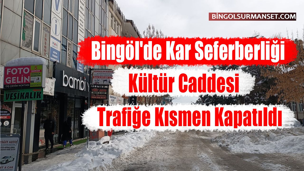 Kent merkezinde önemli arterlerden biri olan Kültür Caddesinin polis evinden sonraki bölümü kar temizleme çalışmaları nedeniyle bugün trafiğe kapatıldı. Bingöl Belediyesi'ne bağlı ekipler, cadde üzerinde kar temizleme ve buzlanmayı önleme çalışmalarını başlattı. Çalışmaların tamamlanmasının ardından caddenin tekrar trafiğe açılması planlanıyor.