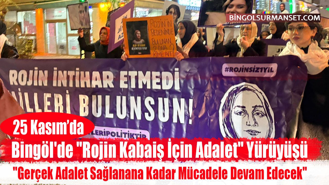 Rojin Kabaiş İçin Adalet Komisyonları, 25 Kasım Kadına Yönelik Şiddete Karşı Uluslararası Mücadele Günü'nde Bingöl'de bir yürüyüş gerçekleştirdi. Katılımcılar, "Rojin'in intihar etmediğini mücadelemizle kanıtladık. Failler bulunana, cezalandırılana kadar her sokakta bizi göreceksiniz" mesajıyla adalet talebini yineledi.