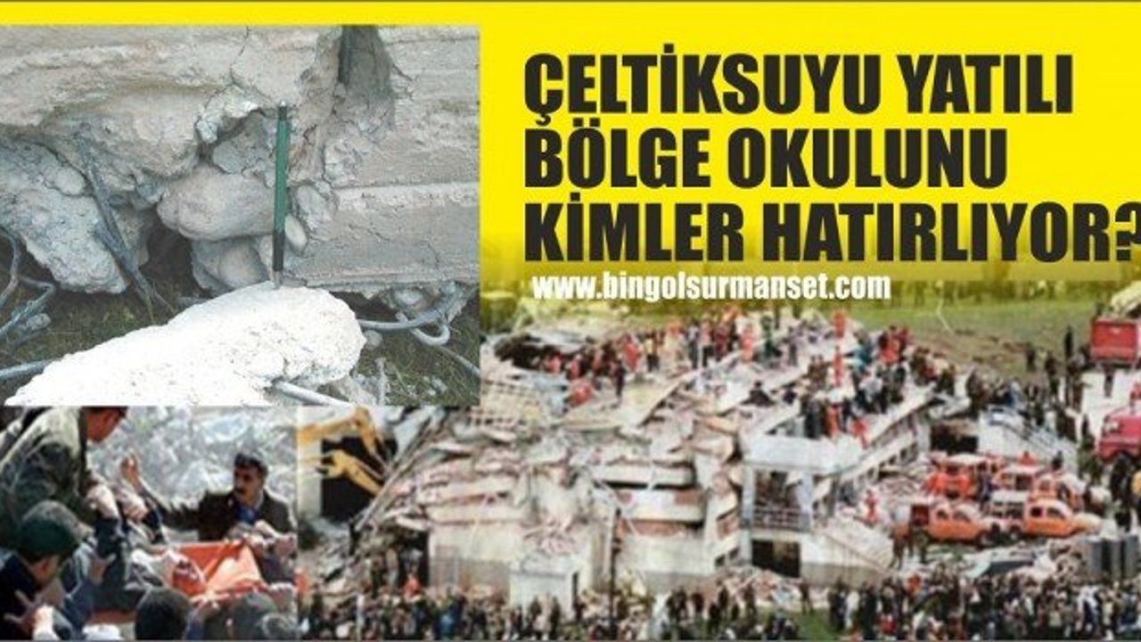 Bingöl’de 2003’te 6,4 şiddetindeki depremde çöken Çeltiksuyu Yatılı İlköğretim Bölge Okulu'nda 84 öğrenci ve 1 öğretmen hayatını kaybetti. İTÜ'lü Öğretim Üyesi Prof. Dr. Okan Tüysüz; “2003 Bingöl Çeltiksuyu Yatılı Bölge Okulu: Kimler hatırlıyor?” adlı bir paylaşımla o dönemde yapılan bir çalışma ile ilgili bir görsel paylaşarak; “2003 Bingöl Depremi Çeltiksuyu Yatılı Bölge Okulu: 84 Can gitti. Bu fotoğraf yıkılan bir kolondan. Beton içerisindeki devasa çakıllara ve demire dikkat. Çakılın betonda bıraktığı boşluk sıva ile kapatılmış, bina deprem olana kadar ayakta zor durmuştu. Tanıdık geldi mi?” ifadeleri ile o dönemde o okulunun göz göre göre nasıl yıkıldığını hatırlattı. HABER MERKEZİ