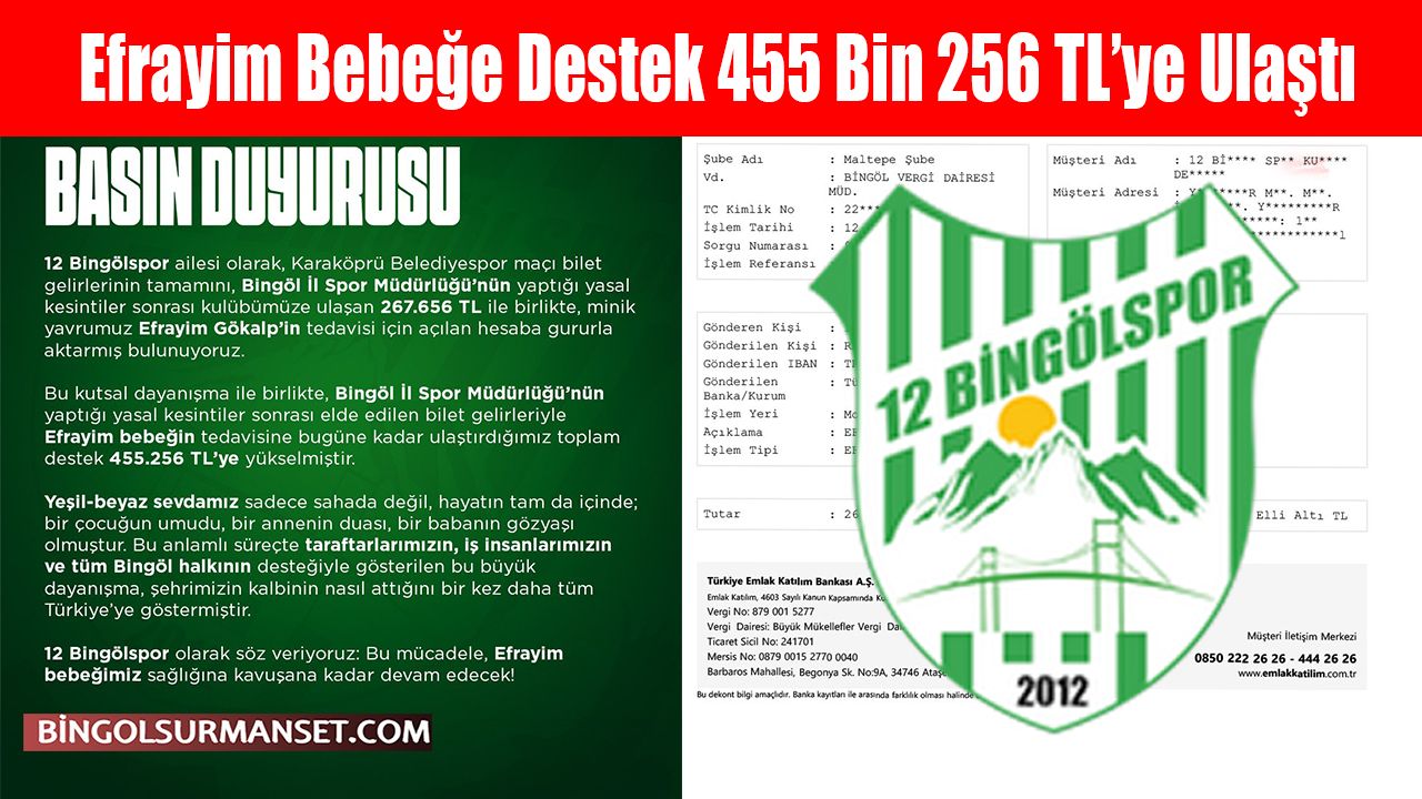 12 Bingölspor, minik Efrayim Gökalp’in tedavisi için şimdiye kadar 455 bin 256 TL destek sağladı. Karaköprü Belediyespor karşılaşmasından elde edilen bilet gelirlerinin, Bingöl İl Spor Müdürlüğü’nün yasal kesintileri sonrası kulübe ulaşan 267 bin 656 TL’lik kısmı, tedavi hesabına aktarıldı.