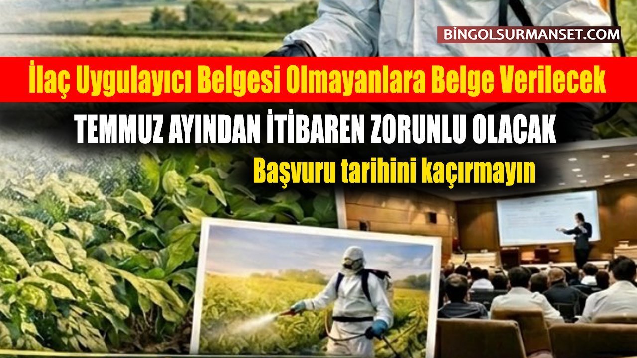 Bingöl İl Tarım ve Orman Müdürlüğü'nden yapılan açıklamaya göre, 2026 yılı Temmuz ayı itibarıyla tarımsal üretim faaliyetlerinde bulunan ve Bitki Koruma Ürünleri (BKU – zirai ilaç) uygulaması yapan üreticiler için "Bitki Koruma Ürünleri Uygulama Yetki Belgesi" bulundurma zorunluluğu getirilecek.