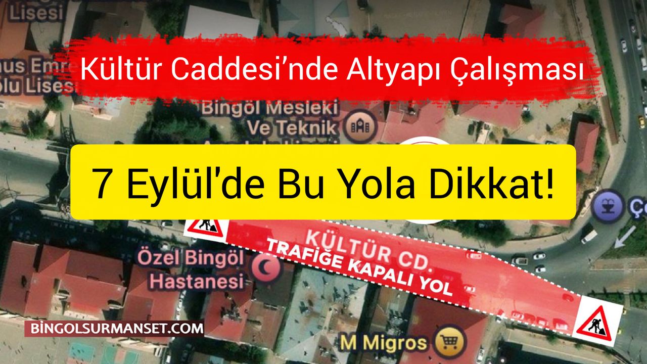 Bingöl Belediyesi, şehir merkezinde yürütülen altyapı çalışmaları kapsamında önemli bir duyuru yaptı. Belediye’den yapılan açıklamada, 07 Eylül Pazar günü Kültür Caddesi’nin belirli bölümlerinin kanalizasyon yenileme ve bakım çalışmaları nedeniyle araç trafiğine kapatılacağı belirtildi.