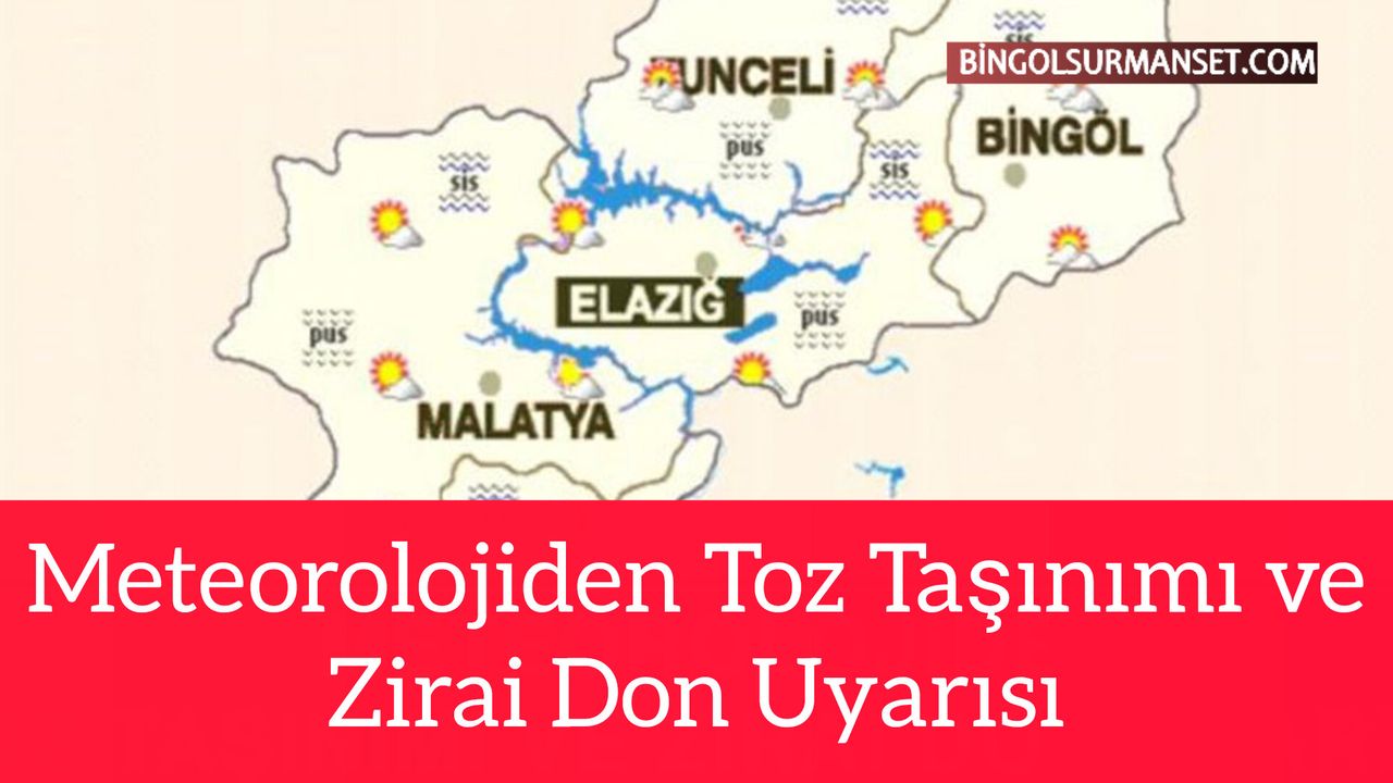 Meteoroloji 13. Bölge Müdürlüğü’nden yapılan açıklamada, "Elazığ, Malatya, Tunceli ve Bingöl çevreleri ile Adıyaman'ın kuzey kesimlerinde hafif, yer yer orta şiddette zirai don beklendiğinden dikkatli ve tedbirli olunması önem arz etmektedir. Bölge genelinde toz taşınımı beklendiğinden meydana gelebilecek görüş mesafesinde düşme, ulaşımda aksamalar, hava kalitesinde azalma gibi olumsuzluklara karşı dikkatli ve tedbirli olunması önem arz etmektedir" denildi