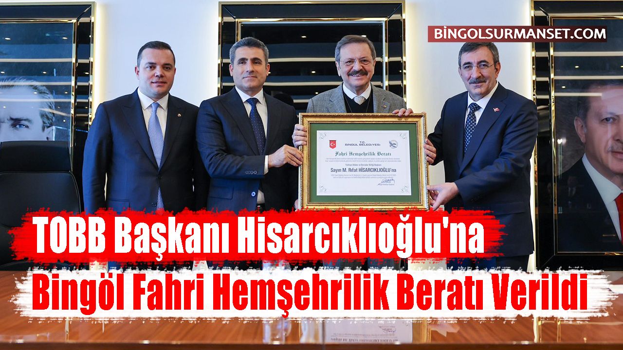 Cumhurbaşkanı Yardımcısı Cevdet Yılmaz, Bingöl ziyaretinin bir ayağında Belediye Meclisi'nde önemli bir tevcih törenine katıldı. Bingöl Belediye Meclisi'nin almış olduğu kararla, Türkiye Odalar ve Borsalar Birliği (TOBB) ve Dünya Odalar Federasyonu Başkanı Rifat Hisarcıklıoğlu'na "Fahri Hemşehrilik Beratı" verildi.