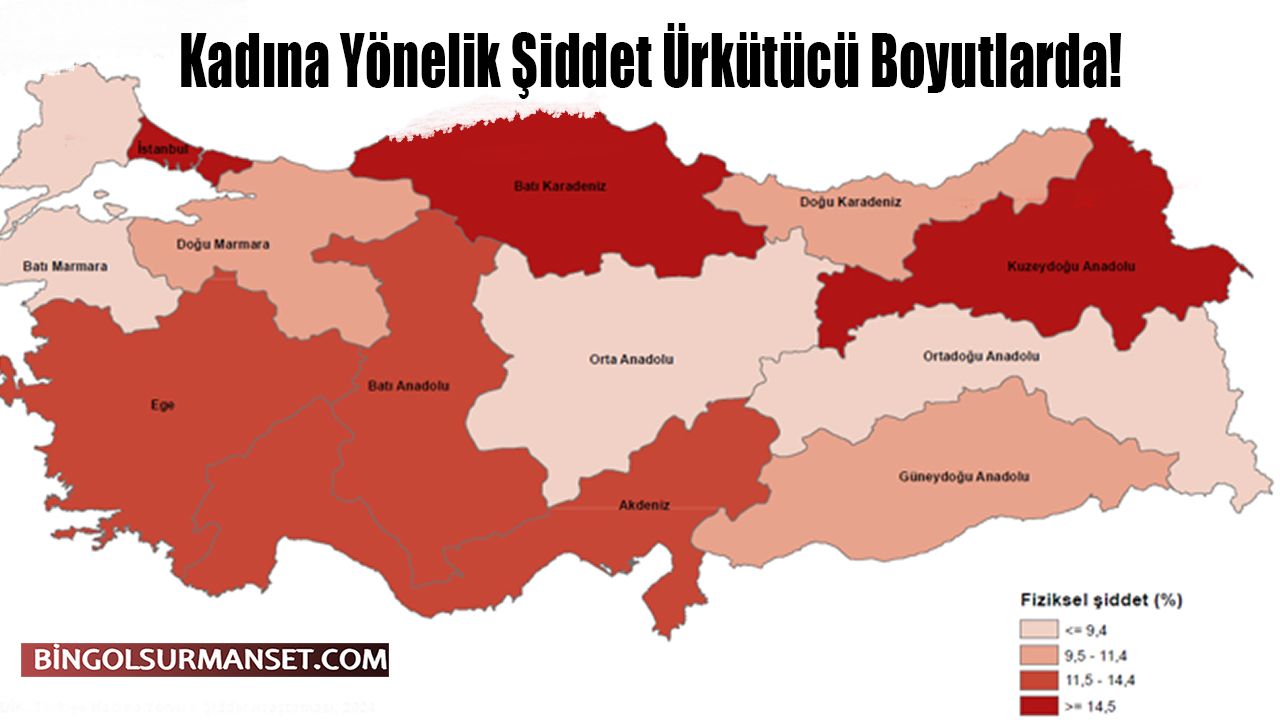 Araştırmaya göre, yaşamının herhangi bir döneminde fiziksel şiddete maruz kalan kadın oranı %12,8 olarak belirlendi. Fiziksel şiddetin en yüksek olduğu bölge %25,9 ile Kuzeydoğu Anadolu olurken, en düşük olduğu bölge ise %8,8 ile Ortadoğu Anadolu Bölgesi oldu. Bu bölgede Bingöl, Malatya, Muş, Bitlis, Elazığ, Tunceli, Van ve Hakkari gibi iller yer alıyor.