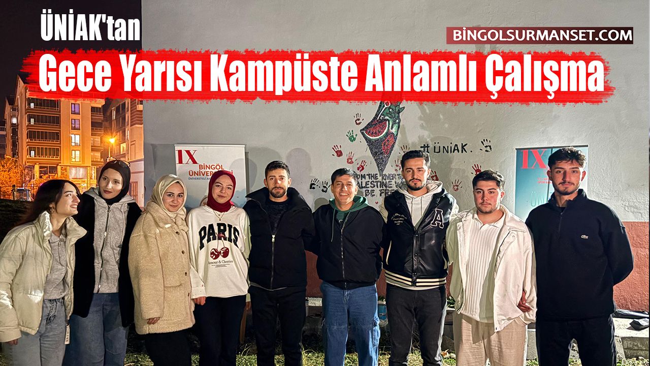 Gece saatlerinde bir araya gelen ÜNİAK gönüllüleri, duvara çizdikleri figürler, semboller ve mesajlarla Filistin halkının çığlığını kampüsün duvarlarına taşıdı. Etkinlikte; adalet, merhamet, birlik ve özgürlük vurgusu ön plandaydı. Her detay, Filistin’in yıllardır süregelen mücadelesine dikkat çeken bir anlam taşıdı.