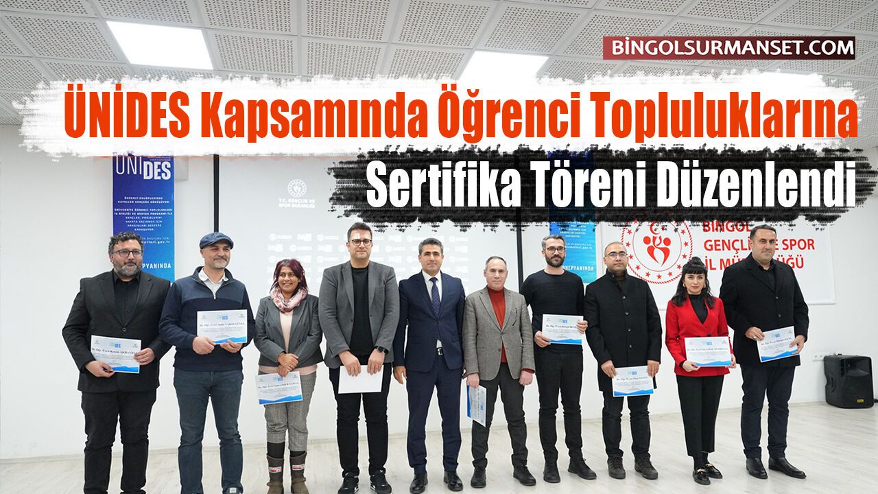 Gençlik ve Spor İl Müdürlüğü Konferans Salonu’nda düzenlenen Üniversite Öğrenci Toplulukları İş Birliği ve Destek Programı (ÜNİDES) sertifika törenine Bingöl Valisi Dr. Ahmet Hamdi Usta, Belediye Başkanı Erdal Arıkan, Bingöl Üniversitesi Rektörü Prof. Dr. Erdal Çelik, Vali Yardımcısı Fahri Onay, İl Jandarma Komutanı Sabri Küyük, Gençlik ve Spor İl Müdürü Mahmut Uğur Duyar, İl Millî Eğitim Müdürü Mustafa Özel, akademisyenler ve öğrenciler katıldı.