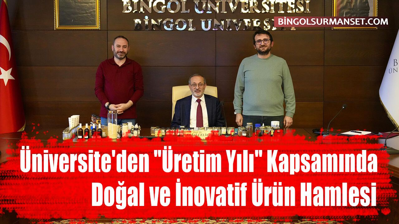 Bingöl Üniversitesi'nde 2026 yılının "Üretim Yılı" ilan edilmesi kapsamında yürütülen Ar-Ge çalışmaları somut ürünlere dönüşmeye başladı. Fen Bilimleri Enstitüsü Müdür Yardımcısı ve Türk Patent ve Marka Kurumu Sınai Mülkiyet Danışma Birimi Yöneticisi Dr. Öğr. Üyesi Enes Kaya tarafından geliştirilen doğal ve yenilikçi ürünler, Rektör Prof. Dr. Erdal Çelik'e sunuldu.