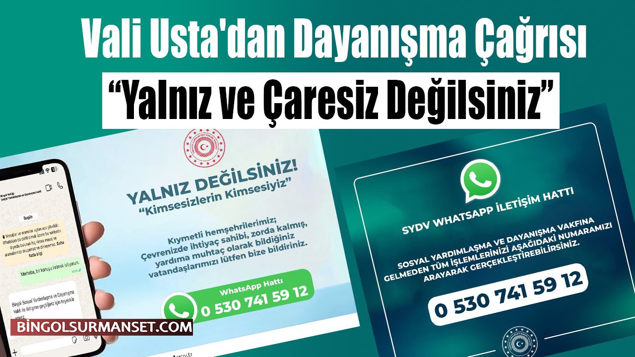 Vali Usta paylaşımında, çevresinde yardıma muhtaç, zorda kalmış ya da destek ihtiyacı olan kişileri tespit eden vatandaşların, bu bilgileri Bingöl Valiliği Sosyal Yardımlaşma ve Dayanışma Vakfı’nın 0530 741 59 12 numaralı WhatsApp hattına iletebileceklerini duyurdu.