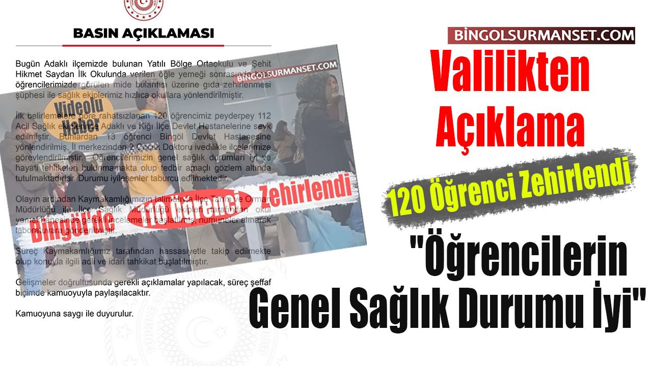 Toplam 120 öğrenci, 112 Acil Sağlık ekipleri tarafından Adaklı ve Kiğı İlçe Devlet Hastaneleri'ne nakledildi. Bunlardan 13 öğrenci, daha ileri tetkik ve tedavi için Bingöl Devlet Hastanesi'ne sevk edildi. Ayrıca, iki çocuk doktoru Bingöl'den ilçelere görevlendirildi. Valilik, öğrencilerin genel durumlarının iyi olduğunu ve hayati tehlikelerinin bulunmadığını, durumu iyileşen öğrencilerin taburcu edildiğini bildirdi.